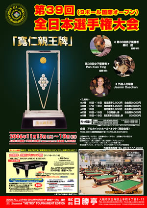 難波JJで開催されますトーナメントの続報です。 女子アマチュアが美味しいと言ってましたが…m(_ _;)m ゴメン!! 以下の内容に決定です。 決勝 平成18年12月10日 (日) 予選日 1.平成18年10月22日 START AM10:00 2.平成18年11月 5日 START AM10:00 3.平成18年11月12日 START AM10:00 4.平成18年11月23日 START AM10:00 5.平成18年12月 3日 START 未定 *予選5は最終調整日です 決勝ベスト32未決定・欠場の場合の予備日です 各予選日共 AM9:00までに受付を済ませてください。 *受付時間に遅れますと失格になります。 賞金 ベスト32まで 優勝\300,000 試合方法 US9ボール ハンデ戦 ブッシュアウト採用シングルイルミネーション(NBA制定ルール) 各予選共64名締切り8名残し ・女子プロ 6セット ・A級 7セット ・B級 5セット 難波ビリヤードJJ TEL 06-4396-5539 店内の申込用紙にご記入の上、FAXをお送りいただくか メールにてお申し込み 氏名 性別 連絡先TEL クラス 1~4の希望予選日をご記入下さい 一旦、お申し込みされますとキャンセルできません 各予選日の6日前ま先着順(敗者再エントリー可) 女子プロ(招待選手)及びアマチュア \6,000‐申込先締切り参加資格エントリー
