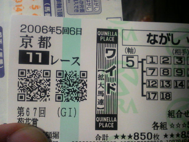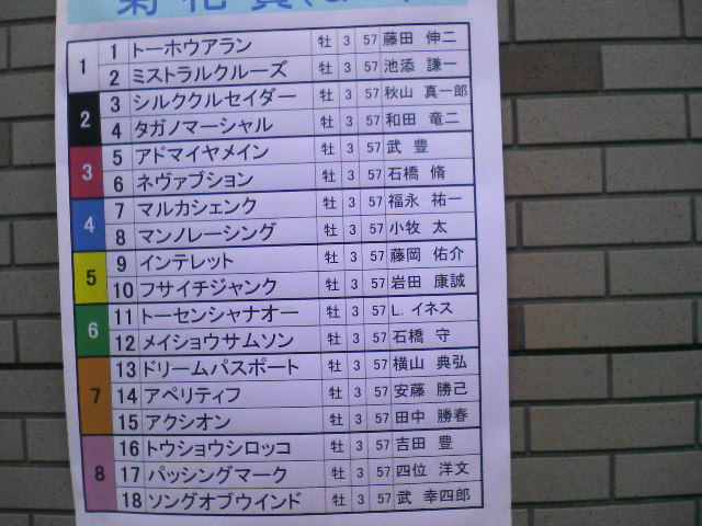 11R 2006年10月15日(日)15:40発走 第11回秋華賞(GI) 芝・右 2000m サラ系3歳 オープン 1 キストゥヘヴン牝3/鹿毛 戸田博文 (美浦) 55.0kg安藤勝己 2 ソリッドプラチナム 牝3/黒鹿毛 田中章博 (栗東) 55.0kg 小牧太 3 タッチザピーク 牝3/青鹿毛 田中章博 (栗東) 55.0kg池添謙一 4 シェルズレイ牝3/芦毛 松田国英 (栗東) 55.0kg 岩田康誠 5 フサイチパンドラ牝3/栗毛 白井寿昭 (栗東) 55.0kg 福永祐一 6 ブルーメンブラット 牝3/黒鹿毛 安藤正敏 (栗東) 55.0kg川島信二 7◎ シークレットコード牝3/栃栗毛 森秀行 (栗東) 55.0kg横山典弘 8 ホウショウルビー牝3/鹿毛 領家政蔵 (栗東) 55.0kg 藤岡佑介 9 アドマイヤキッス牝3/栗毛 松田博資 (栗東) 55.0kg 武豊 10 ヤマトマリオン牝3/鹿毛 安達昭夫 (栗東) 55.0kg幸英明 11 キープユアスマイル牝3/栗毛 高橋祥泰 (美浦) 55.0kg 田中勝春 12 カワカミプリンセス牝3/鹿毛 西浦勝一 (栗東) 55.0kg 本田優 13 サンドリオン 牝3/鹿毛 安田隆行 (栗東) 55.0kg秋山真一 14 ブロンコーネ牝3/鹿毛 池江泰郎 (栗東) 55.0kg和田竜二 15 ニシノフジムスメ牝3/鹿毛 藤原英昭 (栗東) 55.0kg 藤田伸二 16 アサヒライジング 牝3/鹿毛 古賀慎明 (美浦) 55.0kg柴田善臣 17 トシザサンサン牝3/芦毛 鮫島一歩 (栗東) 55.0kg熊沢重文 18 コイウタ牝3/栃栗毛 奥平雅士 (美浦) 55.0kg吉田隼人 昨年、秋のGⅠシリーズは何と的中率が60%を上回りました。 果たして今年はどうなるか? ∈・^ミ ヒヒィーン 。・。・゚★・。・。☆・゚・。・゚ ☆~|||||"\( ̄ ̄*) キンコンカンコンコーン 発表のお時間がやってきました。 ※馬番⑦ シークレットコード牝3からワイド流し&馬連流し! ※枠の4-5を厚めに!!