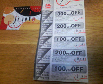 何と貸し切り状態でした(^^;) 何処かのSNS中カキコに、 ビリヤードブームの再来か!? お店が人で一杯やから冷房が利かない云々と言うのが有りましたが… このお店にはあまり関係が無いようで… 時間が月曜日のお昼間ですしね(^^;)…でも。 最近よく寄せて貰ってるまんが&インターネット「時楽」さんで、 先日ポイント特典のプレゼントを頂きました。 これ以外にも新会員の特典や友達を紹介したら半額とか… 若い子達は流れるやろなあ? 合計900円は大きいでしょ! まあ条件は巧く設定してますがね! 全然関係ないですが、新しいキューを手に入れました! チョット変わってるでしょ? オークに置き傘してたらキッチリメンテナンスしてくれてました(^^;) 流石、優秀な店員さん達…