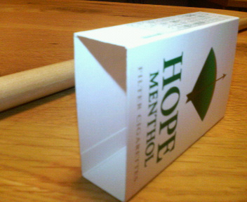 プールプレイヤーに書いた日記から転記しました。 ショートホープ空き箱練習法 この練習方法は、昔昔その昔(高校生の時)に、 元町ビリヤードの女店主さんから直伝で教わりました。 兵庫県尼崎市武庫元町って所に有ったお店です。 四つ球が二台とポケット三台のお店です。 ポケットが空いてないときは四つ球をしてました。 その女店主さんかなりの高齢(原田美枝子の師匠位かな?)だったんですが、 眼光鋭く、タマにお客が居ないときにキューを握ってて、 偶然見かけたときには凄いタマを撞いてました。 お客の前では一切撞かないし聴かない限りコーチングは無しでした。 しかし、真っ直ぐに撞けなかった僕の為に、 引き出しから出してきたのがショッポの空箱でした。 丁度、阪急ビリヤード場でレールブリッジを丁寧に教えてくれた、 藤間一男をうっとうしいオッサンやな?って思ってたあの時期です。 (世間知らずの怖い者知らずで…) 初めてマイキュー(他店で買ったのにも関わらず)を買った時、 ニッケのラシャでシャフトカバーを作って頂きました。 良くして頂いたのが懐かしい思い出です。 ココの店を知ってるっていうのはかなりマニアックでは…(^^;) 昔はビックリするレジェンド達がそこいら辺にウヨウヨ居ましたねえ~ 僕は恵まれていたんですね。 でもその時は全く恩恵を頂けなかったけどね、 その方達の価値が全く理解不能だったから…(>_<)