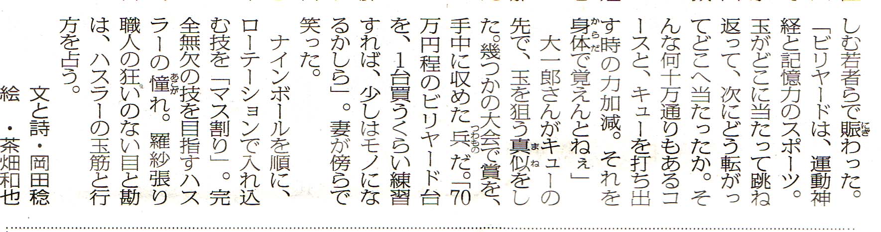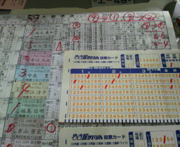 この友人は競馬名人なんですが、 競輪は初めてだったんです。 昨年、逆のパターンで競馬場デビューを, 東京の競馬場でさせていただき、 万馬券を取らせてくれました。 (本人は買ってなかった…僕は流して当たり) そのお返しに今日は競輪でたっぷりと… 昨日からデーター処理を万全に、 名古屋競輪場入りを果たしました。 ブログ愛読家の皆さんはよくご存じのように、 僕が頭鉄板(マジで)指示を出すと、 85%以上の高確率で的中しますが、 僕が推奨した2着選手は3着になるケースがまた同じくらい高確率なんです(^^;) そこで現場では友人に僕の頭・ヒモを一着三着の3連単流しをすれば、 かなりの高確率で当たるとコーチングしました。 友人は素直にマークシートを塗りつぶし穴場へ… 僕はいつものように鉄板の⑨号車頭から連単⑨→①勝負! 鐘鐘鐘カンカンカン… 9号車一着でゴールイン!2着は!? 例の如く僕は一着三着(>_<)(T_T) しかし、友人は的中させることが出来た(^_^)v と、思いきや、何やら浮かぬ顔??? 何と初めに塗りつぶしたマークシートを紛失し穴場で急いで塗りつぶしたら、間違って塗りつぶしたようで…はあ(>_<) まあ気を取り直して次ぎへ… ココでもう一言コーチング。 買い目を決めたら必ず100円でも勝負目の裏は勝っておくようにでした。 それも素直に聴いていた友人、 ①の頭が鉄板レースでヒモは僕の抜け目の④をくっつけてました。 なかなか面白いなあ(穴やな)って言ってはいましたが、 こころの中では④は無いヤロって思ってました。 勝負事は恐ろしい(^^;) 少し千切れ気味で先行を追走になった①番車、 最終バックは④号車を牽引する先行選手のような展開に… 流石にあの展開では足のない④号車もゴール前はキッチリ。 決定!一着④番2着①番…(T_T) でもまた今度こそ友人が取ったからまあ良いかって! しかも、払戻金が12,450円出たー万車券! 馬のお返しが出来て満足。 って思いきや… ”やってもた!裏買って無いって…”:友人 ドッカーンドッカーンドッカーンって花火と稲光のコラボ(T_T) でも終わりよければ全て良し!? 最後と決めた第9レース、 コレも頭鉄板① ①→②×××円 ①→③ ①→④ 友人には①②③のグルグル(ボックス)が面白いよ!って また素直な友人は今度こそ間違えることなくグルグル… 鐘鐘鐘カンカンカン…3番館(>_<)←晩餐館? 主導権を奪ったのは②号車のライン②号車は番手絶好!! 交わしたところに伸び足鋭く①号車がブチューブチューブチュー ヨッシャー!!①→②頂き ¥¥¥¥¥¥¥やったー札束が(^_^)v うん?なに! 決定は写真を参考に決定いたします。 決定までしばらくお待ち下さい。 …長い、やばいな同着? えええーーーもしかしたら届いてない!? 決定! 一着同着①番②番 かああ(>_<) まあ友人がまともに的中してくれたから良かったけど… 僕は②→①を500円しか買ってないですから(>_<) ①→②も的中ですが半額以下に(T_T) まあ最後は二人仲良く払い戻しに並んで目出度し目出度し?かな 毎日新聞のビリヤード記事 ↑ これは毎日新聞朝刊のビリヤード記事です(クリック)。 二枚目の写真は1枚目の切れたつづきの記事です(^^;) 追伸 上のサムネイル写真をクリックしてから、 ブラウザーの右下拡大アイコンも併せてクリックして下さいね! 拡大アイコンが出ない場合は写真上で左クリックしたら出ると思います。 この欄へのご意見、ご感想は tokaimen@maing.co.jp 毎日新聞「東海面」係へ