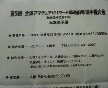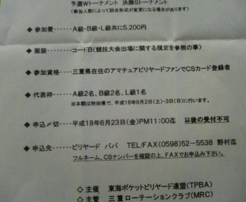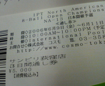 でもPコード番号が分からず少々悪戦苦闘を(^^;) Pコード 一日券 807-807 通券 679-933 もし皆さんの中にチケット購入される方がおられましたら、 上記番号を控えて、チケットぴあへ行ってください。 日時:2006年6月9日(金)~11日(日) 10:00~22:00(予定) 会場:サンビリ荻窪店(JR中央線 荻窪駅 徒歩2分) 住所:東京都杉並区上荻1-16-16 ユアビルI 7F TEL:03‐5349‐8303 フォーマット ルールはIPTオフィシャルルールに基づいて行います。 エイトボール 10ゲーム先取 Wイリミネーション 勝者ブレイク(ブレイクボックスあり) 2名が7月22日~30日アメリカ(ラスベガス)で行われる、 IPT North American 8-Ball Open Championship本戦へ出場できます。 観 戦 入場料:1日/前売り\2,000 当日\2,500 チケットぴあ 3日間通券 \5,000 5月26日発売開始 Pコード 一日券 807-807 通券 679-933 ※あくまでもこれは観戦チケットであって、予選出場とは関係ありません!