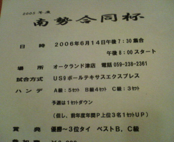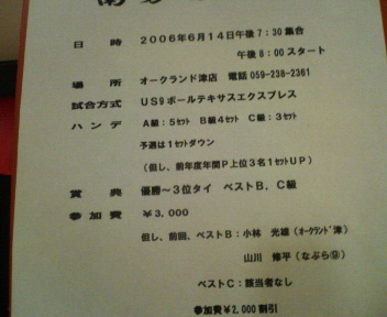 津市のオークランドCITYにて、明日は熱戦が繰り広げられる事でしょう。 さて優勝は誰の手に? 難しいねえ! 個人的には…オッと危ない危ない(^^;) 皆さんを応援してます。 優勝の方サイン下さいね そういえば伊勢中川の駅を宗田プロ(ゴッドドラゴン)が歩いてたのはちょっとびっくりした。 ああ!セントラルレディースやって思い出した(^^;) ↑ 別に他意は<(_ _)>←殴られる!?