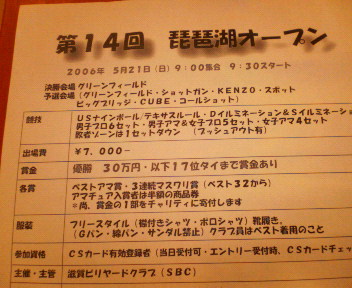 2006年 琵琶湖オープン 優勝 穂高秀条選手! 写真はオンザヒル様から無断で拝借(-_-) 土方プロも惜しかった 来年は優勝目指して頑張るぞー!(^^;) 松浦辰夫(オークランド豊田)選手、栗林プロに勝利も素晴らしい。 いくら身体の調子が悪かった栗林プロとはいえ、 栗林プロに勝ったうえに五位タイは流石。 いつもは姉妹店のオークランド津でお世話になってますが、 いつかオークランド豊田に武者修行に行きます。 オークランド津からも上●選手決勝2回戦目新井選手(14-1研究会)を下し、 決勝3回戦進出も惜しい内容で…(^^;)また次回も頑張って下さい。 スポットからの予選通過者 9組 伊藤 瑞規 イトウミズキ 所属 sun (ORC) クラス A 10組 猪口 政一 イノグチセイイチ 所属 喜楽 クラス A 11組 高田淳 タカダアツシ 所属 なみえ クラス A 12組 上○英● ■エダ△デキ 所属 オークランド津 クラスA 13組 梶山美幸 カジヤマヨシユキ 所属sun クラスA