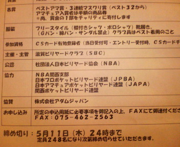 詳しくは本家(ISOブログ)をご覧下さい。 日時:2006年6月9日(金)~11日(日) 10:00~22:00(予定) 会場:サンビリ荻窪店(JR中央線 荻窪駅 徒歩2分) 住所:東京都杉並区上荻1-16-16 ユアビルI 7F TEL:03‐5349‐8303 フォーマット ルールはIPTオフィシャルルールに基づいて行います。 エイトボール 10ゲーム先取 Wイリミネーション 勝者ブレイク(ブレイクボックスあり) 2名が7月22日~30日アメリカ(ラスベガス)で行われる、 IPT North American 8-Ball Open Championship本戦へ出場できます。 観 戦 入場料:1日/前売り\2,000 当日\2,500 チケットぴあ 3日間通券 \5,000 5月26日発売開始 見学も良いですが、出来れば出たいですね!冷やかしで(^^;) 是非、交渉頑張って下さい。