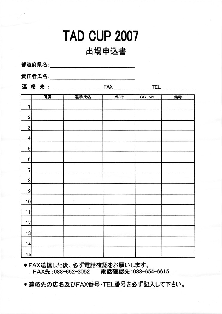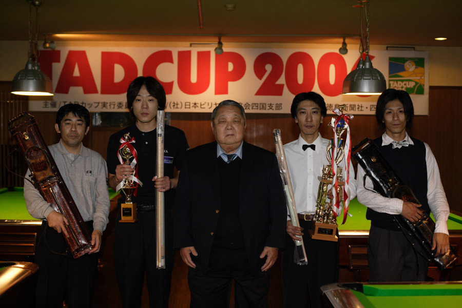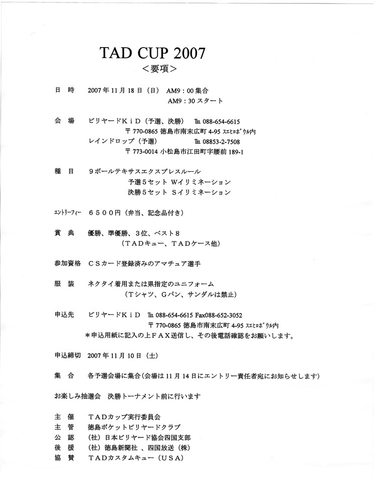 日時:2007年11月18日(日)午前9時集合9時半スタート 会場:ビリヤードKID(予選・決勝)電話088-654-6615 レインドロップ (予選) 電話08853-2-7508 種目:9ボールテキサスエクスプレスルール 予選5セットWイリミネーション 決勝5セットSイリミネーション 費用:6500円(弁当・記念品付き) 賞品:優勝・準優勝・三位・ベスト8(TADキューやTADキューケース) 参加資格:CSカード登録済みのアマチュア選手 服装:ネクタイ着用または県指定のユニフォーム(Tシャツ、Gパン、サンダルは禁止) 申し込み先:ビリヤードKID 電話088-654-6615 FAX088-652-3052 ※申込用紙に記入の上FAXにて送信後にお電話を入れて下さい。 締め切り:2007年11月10日(土) 当日は各予選会場へ集合(予選会場は11月14日にお知らせします) お楽しみ抽選会もあります(決勝トーナメント前) 詳しくはビリヤードKIDさんへお確かめ下さい。 http://www.suehiro-bowl.co.jp/ 下の写真は前回2006年度の栄えある入賞者達です。 ↓ 2006年度のスナップ写真は下記アドレスをクリック! ↓ http://billiard.blog.shinobi.jp/Entry/347/