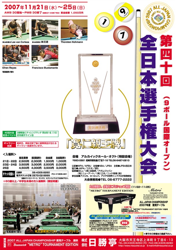 皆さんご存じ、寛仁親王牌:第40回 全日本選手権大会(9ボール国際オープン)が、 我が街、尼崎市で開催されます。 日時 2007年11月21日(水)~25日(日) 午前 9:30開始~午後8:30(最終日7:00終了予定) 会場 アルカイックホール・オクト(特設会場) 〒660-0881 尼崎市昭和通2丁目7-16 TEL:06-6487-0810 ※チケットのご購入は、全国のチケットぴあでお買い求め下さい。 Pコード:809-461 詳しくは日勝亭さんへ! ↓ http://www.nissyotei.co.jp/ 今年はエフレン・レイズも来日するそうで楽しみですね。 日本の選手にも頑張って欲しいですし…ファンの希望はワガママです。 、ヽ`アセ(;~▼~;)アセ、ヽ` マニアブログマニアの方でお越しの方はご一報下さい。 (⌒~⌒)ニンマリ