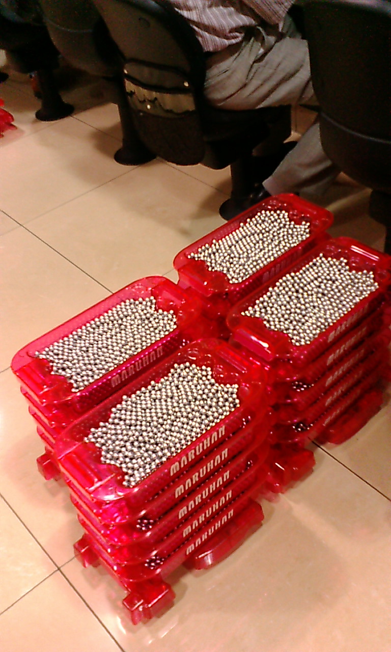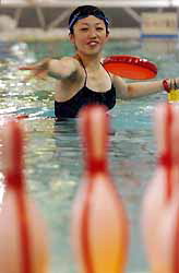 ってビリヤードでは無くて水中ボウリング! とは言っても水中では無く水上です。 これが流行れば…水上ビリヤードか!? ( ̄∇ ̄;)ハッハッハ アクアボウリングは、約20cmのプラスチック製の円盤状のディスクを使います。 ルールは簡単。基本は一般のボウリングと一緒で、6メートル先から水面を滑らせるように投げ、ブイ(発泡スチロール板)の上に磁石で固定された6本のピンを倒します。 1回に3投できる。1ゲームは計3回で、全部倒せばピンを立て直すため、最高点は54点。 ただの水中ウオーキングでは面白くないけれど、投げ終わって円盤を取りに行くことで、楽しく水中歩行できる効果を狙ったスポーツなのだ!! ↑ 新聞ナナメ読み+α様から転記