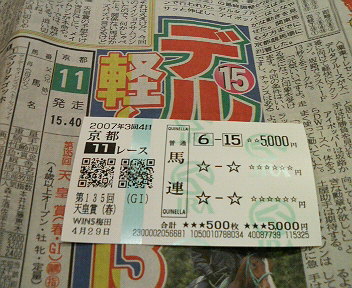 11R 第135回 天皇賞(春)(GI) サラ系4歳以上 オープン (国際)牡・牝(指定) 定量 3200m 芝・右 外 本賞金: 13200、 5300、 3300、 2000、 1320万円 発走 15:40 1 マツリダゴッホ 国枝 栄(美浦)牡4/鹿58.0kg 横山 典弘 2 ファストタテヤマ安田 伊佐夫(栗東)牡8/鹿58.0kg 武 幸四郎 3 ユメノシルシ大久保 洋吉(美浦)牡5/黒鹿58.0kg 吉田 豊 4 アドマイヤモナーク 松田 博資(栗東)牡6/鹿58.0kg 村田 一誠 5 アドマイヤタイトル河野 通文(美浦)牡5/鹿58.0kg 四位 洋文 6 メイショウサムソン 高橋 成忠(栗東)牡4/鹿58.0kg 石橋 守 7 トウカイエリート松元 省一(栗東)牡7/黒鹿58.0kg 川田 将雅 8 アイポッパー清水 出美(栗東)牡7/栗58.0kg 安藤 勝己 9 ウイングランツ高市 圭二(美浦)牡7/鹿58.0kg 秋山 真一郎 10 トウショウナイト保田 一隆(美浦)牡6/栗58.0kg 武士沢 友治 11 マイソールサウンド西浦 勝一(栗東)牡8/栗58.0kg 角田 晃一 12 トウカイトリック松元 省一(栗東)牡5/鹿58.0kg 池添 謙一 13 ダークメッセージ佐々木 晶三(栗東)牡4/栃栗58.0kg 佐藤 哲三 14 ネヴァブション伊藤 正徳(美浦)牡4/黒鹿58.0kg 北村 宏司 15 デルタブルース角居 勝彦(栗東)牡6/鹿58.0kg 岩田 康誠 16 エリモエクスパイア大久保 龍志(栗東)牡4/鹿58.0kg 福永 祐一 恒例の「外れ馬券はどうやって!?」のお時間です。 外れ馬券の筈が…σ(^_^;)アセアセ... 今回もついでに頂きましょう。 例の如くレース直前の佐藤師匠、天の声に注意です。 ズバリ言うわよ! ⑮番デルタブルースのワイド流しです。 馬連⑥-⑮ 枠連1-8 以上。