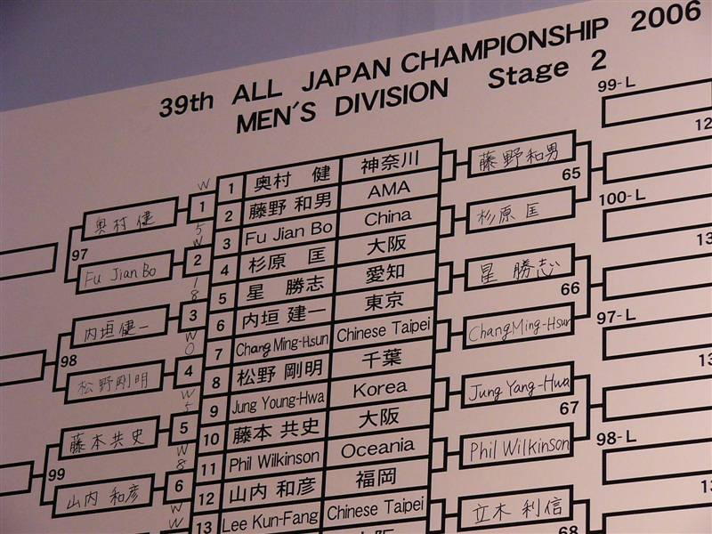 独断と偏見で、ベスト16も出揃っていない時から… 全日本選手権 女子 1① × 梶谷景美 2② 曽根恭子 3③ △ 大谷晃央 4④ 新保まり子 4⑤ ▲ ジャスミン・オーシャン 5⑥ 注 井上直美 5⑦ ◎ パン・シャオティン 6⑧ 宗田三佳 6⑨ ○ 周萌萌 枠番連勝単式 5流し 人番連勝複式 ⑤-⑦ ⑤-⑨ 点数が多くなりましたが…以上です。 (9人に漏れた方すいません、他意はございません) 皆さんの予想をどんどんお寄せ下さい! お待ちしております。 見事的中の方には抽選で、 TADマニアのステッカーをプレゼントします。 (そんなモン要らんわって言わないで…) 追伸 2006年 11月19日(日) 6回京都6日 11R 第23回 マイルチャンピオンS(GI) サラ系3歳以上 オープン (国際)(指定) 発走 15:40 12番の ニューベリーから流し馬券で! 今度こそ!