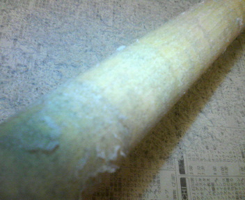従来からのテーパーに戻すべく、 必死のパッチで削りダシを…とろろ昆布職人になれるかも? 、ヽ`(~д~*)、ヽ`…(汗) というのも元々このキューグリップはテーパーがあり、 グリップの中心がかなり細かったんです。 僕は良い感じだったんですが… 友人が革巻きをやってるって言うんで、 じゃあ巻いて貰おうかって気軽に渡してしまったんです。 革を巻くにはテーパーを直す必要があり、 僕もあまり深く考えずに… でも実は革嫌いの僕はそれ以来一回もこのキューを使っていませんでした。 それで革を剥いで目に入ってきたのが、 "/(*▽*) アイタタ・・・ 樹脂でした。 結構、厚くベッタリと… 勿論、カチカチに乾いてますよ どうしようと?悩んだ挙げ句、 気付けば、削りだしてました。 σ(^_^;)アセアセ... まだまだ、半分なんで… (/≧◇≦\)アチャー!! ガンバ!(*゚ー゚)ノ"☆/;^-^)ノベシャッ