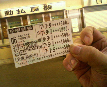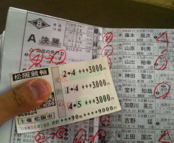2025m(5周)先頭固定競走 発走予定 14:40 電投締切 14:35 1 1 藤本 辰次(松阪) 37 三重 62 A1/A1 追 3.57 0.0 87.67 2 2 山原 利秀(高知) 37 高知 63 S1/A1 追 3.71 0.0 92.12 3 3 山出 裕幸(福井) 22 福井 90 A3/A3 逃 3.57 0.0 87.48 4 4 神田 聖治(松阪) 39 三重 61 A1/A1 追 3.71 0.0 85.14 4 5 堂村 知哉(福井) 23 福井 88 A2/A1 逃 3.57 0.0 85.65 5 6 加奈川 英三(大津) 49 滋賀 41 A2/A2 追 3.85 0.0 78.42 5 7 吉野 猛(一宮) 32 愛知 74 A1/A1 追 3.57 0.0 88.80 6 8 上田 国広(霞ヶ浦) 22 三重 89 A2/A2 逃 3.57 0.0 82.75 6 9 片岡 克巳(玉野) 48 岡山 42 A1/A1 両 3.64 0.0 85.39 誘導 古田 義明 33 三重 79 A1 徹底先行捲り選手では無い上田君の番手から、 捲り足を使った藤本の後ろ④神田選手の抜け出しが… ↑ 地元作戦に期待したいところです(^_^)v コダセイさん聞いて下さい。 準決勝のレース、裏切り者が…5Lの某店店員さん ⑦⑤①で的中でした(T_T) そういう私も…⑦①シコタマ…勿論、①⑦も…(少々<(_ _)>) 決勝は行きマッセー!頭、鉄・鉄・鉄板ー。 買い目は内緒です(オッズが下がるから) 決勝は…(^^;)的中しやした!<(_ _)> いやあ、ははは。 まあ、勝てば官軍と言うことで… ↑ 本当にこれだけかなあ?(-_-)タッドマニアさん