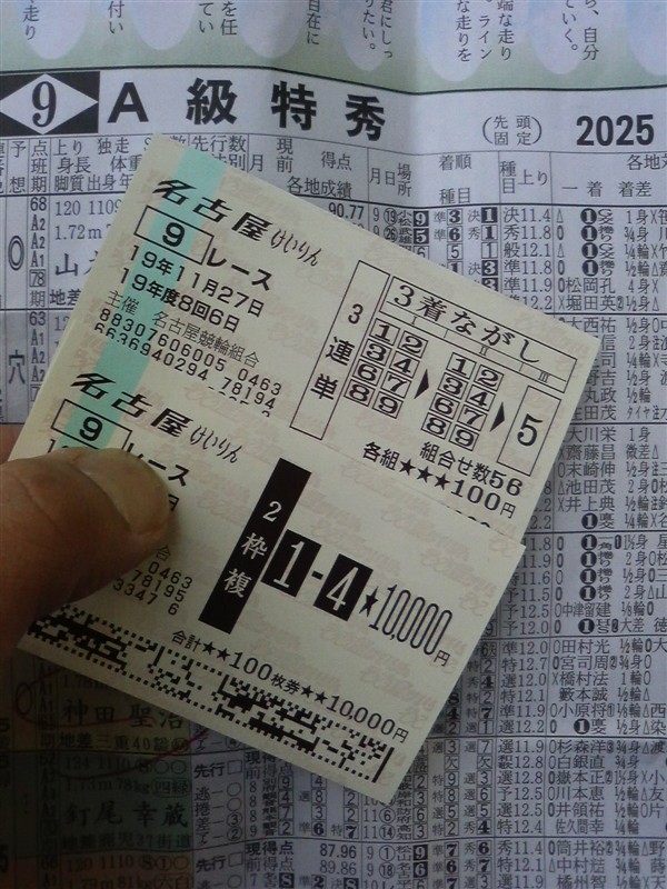 惜しくも三着でしたが…神田さん有り難う。 うふふっ(*゜v゜*) 昨日、名古屋競輪場の最終日にお邪魔しまして… なんと! 久々の万車券が的中しました。 と申しましてもたいした金額を張ってた訳ではありません。 でも嬉しいですね! 買い目の方は… 一応、押さえの三連単車券での的中でした。 勿論 本戦も大的中! 必殺、山本山の枠連1-4。 三連勝単式 4-1-5 11,200円 (38番人気) 枠番連勝複式 1=4 270円 (1番人気) おまけ映像! 小倉競輪場 F1シリーズ 4:3:2の必勝パターン!キッチリ中断をキープで捲り一発!!上がり11.6秒最終日に繋がるレース... 2007/11/15(2日目)第3レース(A級選抜) ↓ ビリヤードも競輪もA級選手!好捌きに注目です。小倉競輪場F1シリーズ やっぱり、最終日に繋がりました。 2007/11/16(最終日)第3レース(A級選抜) ↓